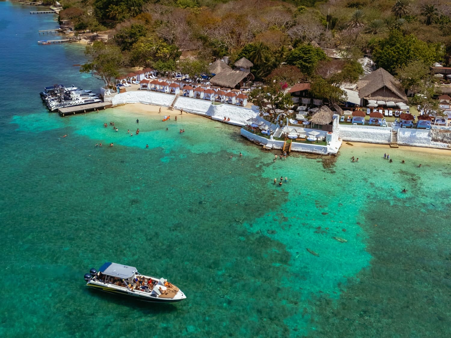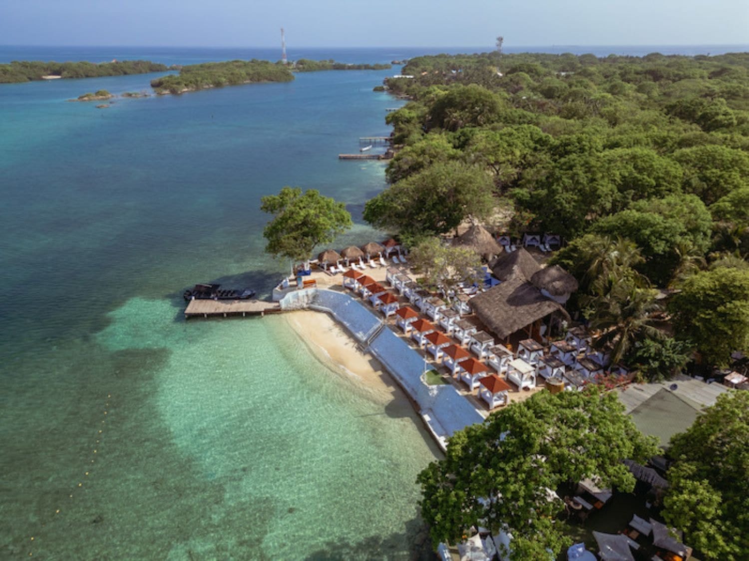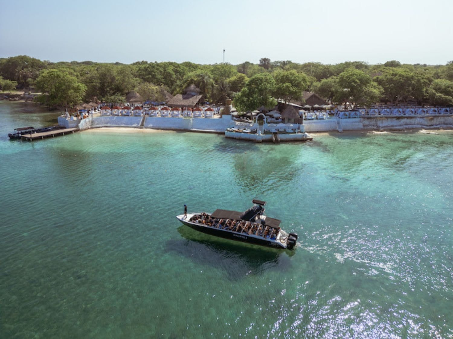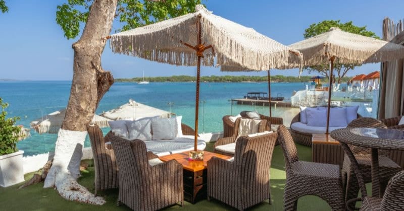 Los viajeros pueden llegar al club en lancha motora desde el muelle La Bodeguita en Cartagena, y disfrutar de un cóctel de bienvenida y un delicioso almuerzo con vistas de ensueño.